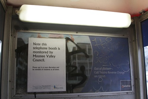 And for some reason this Telstra payphone had received a ‘this telephone booth is monitored by Moonee Valley Council. Please use your discretion and be mindful of residents at all times’ sign.