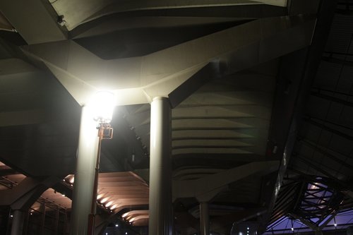 The solution is a mix of LED floodlights and fluorescent batten lights fixed to existing vertical supports, powered via aerial hung cables 3 metres or so above the platform.