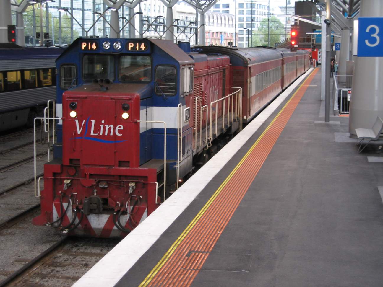 V/line was moving the carriages around in the sidings near Spencer Street, when one set was pushed too far, ending up with the wheels off the track and the carriages sitting on an angle!