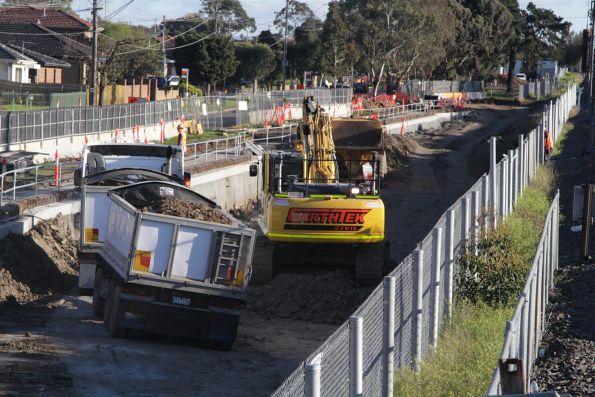 Ground conditions are another variable. Melbourne’s west lies on a bed of basalt all the way down, which unlike the sand found under the recent Frankston line works, need to be slowly broken up before it can be hauled out of the rail cutting.
