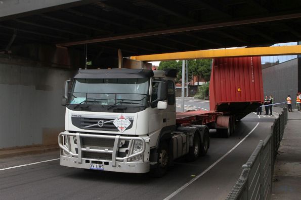 On Sunday 3 March a so-called ‘professional’ driver of a container truck loaded with a single ‘high cube’ 40 foot ISO shipping container bound for the Port of Melbourne tried to make it under the 4.0 metre clearance Napier Street bridge, but ignored the warning signs – striking the bridge and dislodging the container from the truck.
